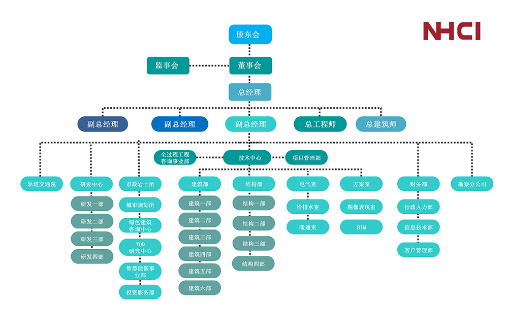 下辖部门包括:研发部门、管理中心、技术中心、全过程工程咨询事业部、财务部、轨道交通院、方案室、建筑部、结构部、机电部、BIM、项目管理部、智慧能源事业部、投资服务部、TOD研究中心、市政岩土所、城市规划所、绿色建筑研究中心、城市产业研究中心、勘察分公司等。党支部、工会、团支部等机构设置完备。