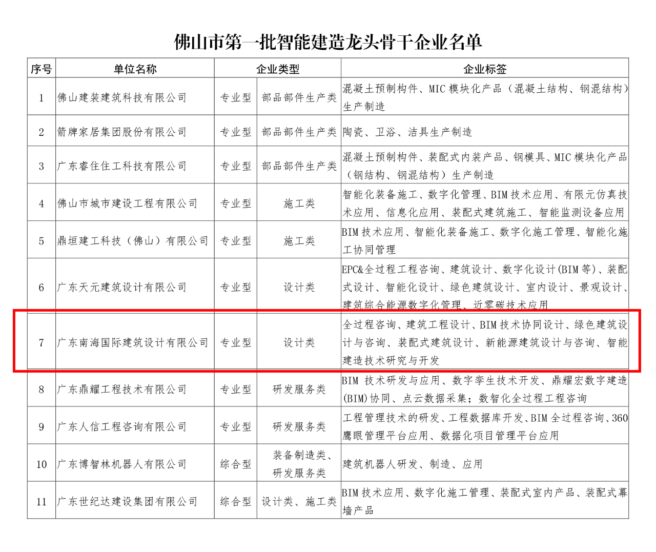 12月14日,佛山市住房和城乡建设局公布佛山市首批智能建造试点项目及龙头骨干企业名单。经单位申请、专家评审、部门审核等程序,确定爱游戏在线等 11 家企业为佛山市第一批智能建造龙头骨干企业。