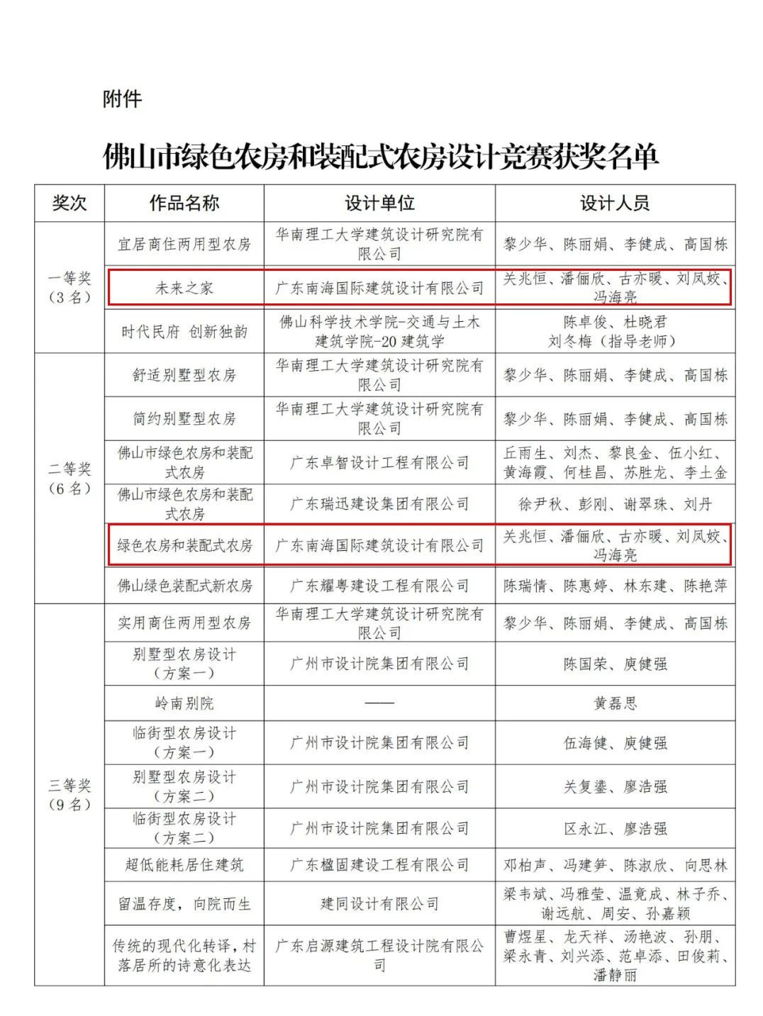 另外,南海国际还选送4个作品参选佛山市南海区住房城乡建设和水利局举办的南海区新时代优秀农房设计方案征集,全部获得一等奖的好成绩。