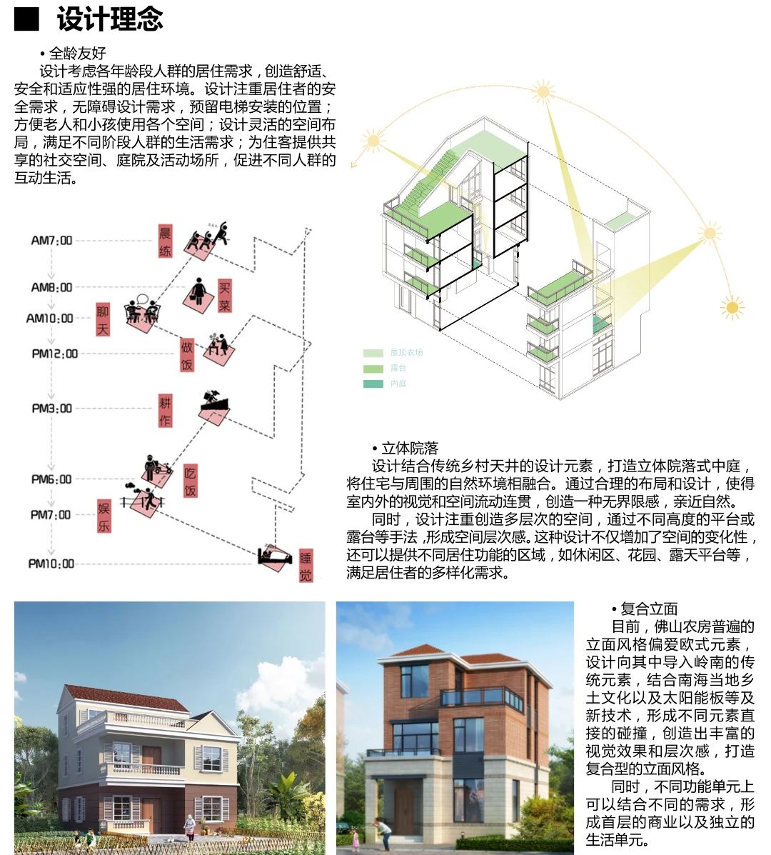 针对佛山农房使用人群老龄化!空间单调固化、屋顶空间闲置立面缺乏特色等普遍存在问题。提出以“未来之家”作为设计理念,采用装配式建筑形式,借鉴岭南特色绿色节能技术,考虑再生能源的利用。