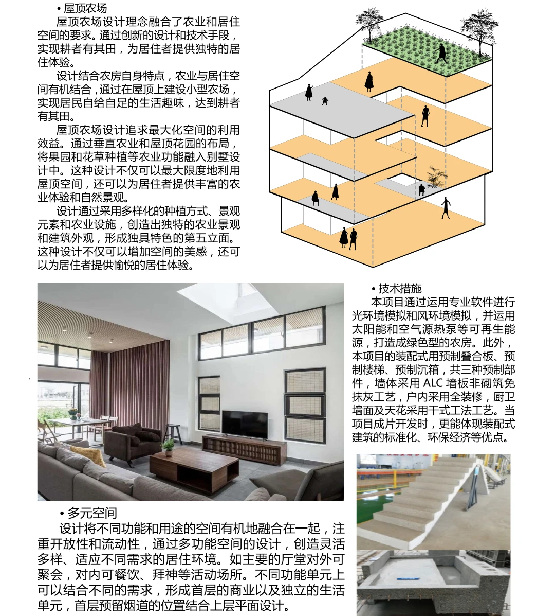 本项目通过运用专业软件进行光环境模拟和风环境模拟,并运用太阳能和空气源热泵等可再生能源,打造成绿色型的农房。此外,本项目的装配式用预制叠合板、预制楼梯、预制沉箱,共三种预制部件,墙体采用ALC墙板非砌筑免抹灰工艺,户内采用全装修,厨卫墙面及天花采用干式工法工艺。当项目成片开发时,更能体现装配式建筑的标准化、环保经济等优点。
