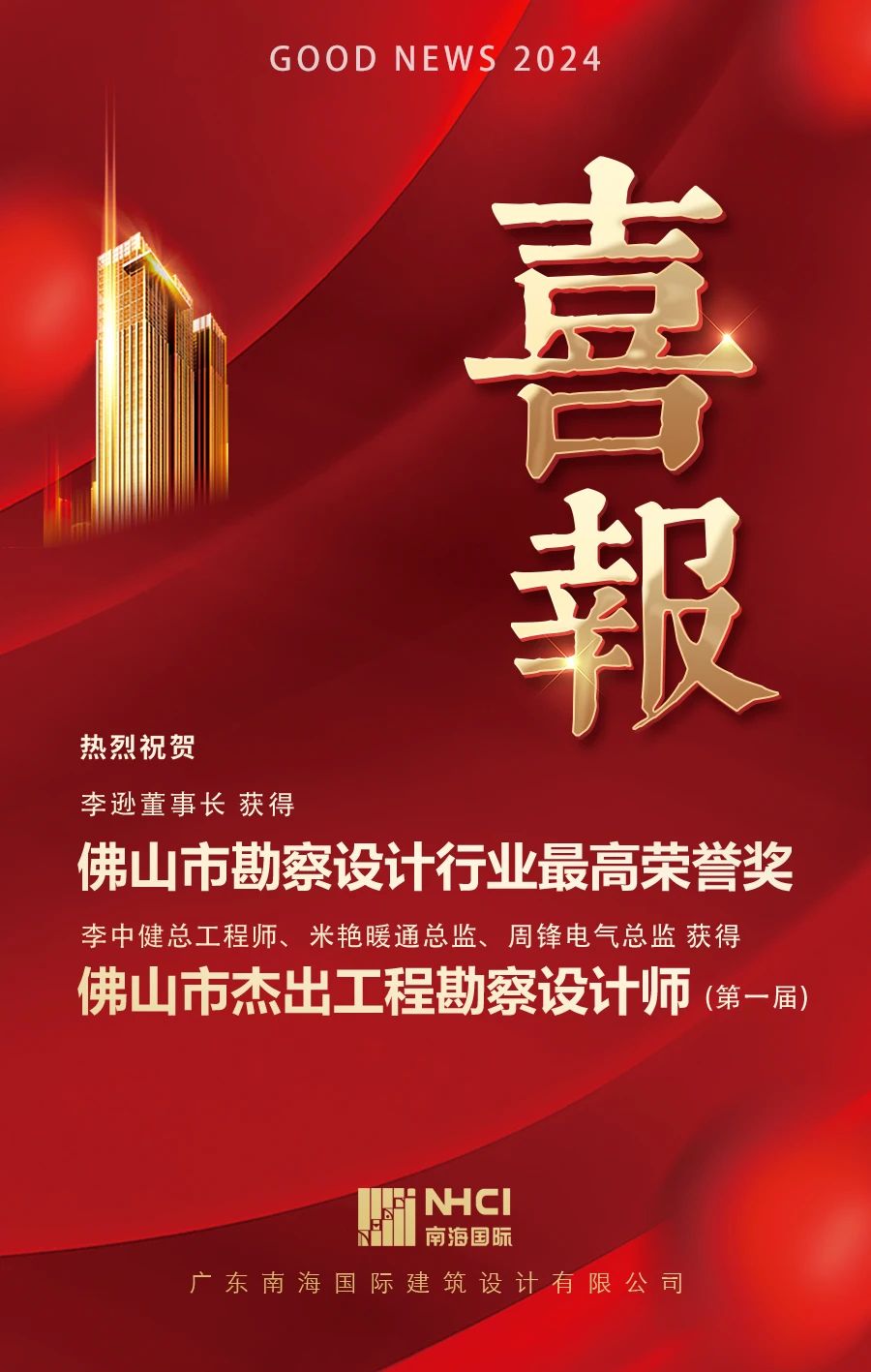 南海国际李逊董事长获得“佛山市勘察设计行业最高荣誉奖”。李中健总工程师、米艳暖通总监、周锋电气总监获得“佛山市杰出工程勘察设计师”称号。