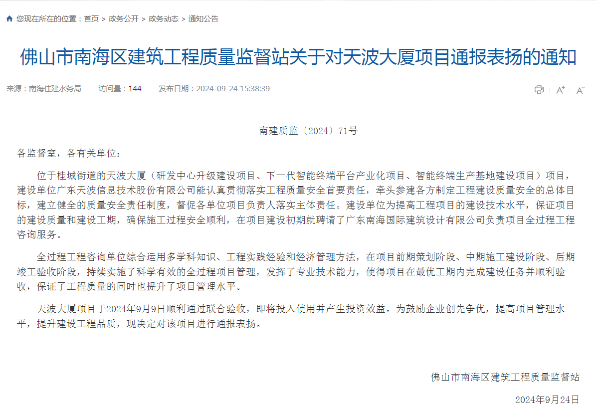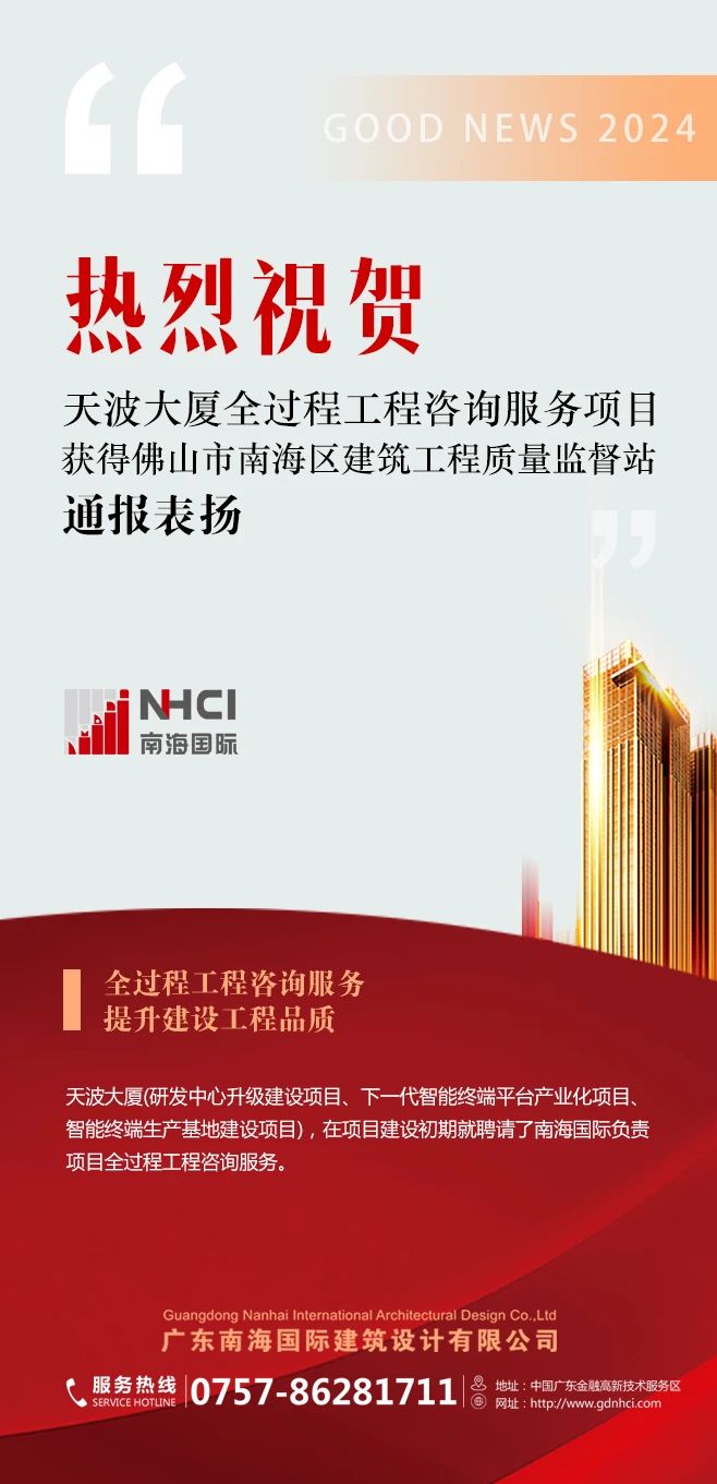近日,我司负责全过程工程咨询服务的天波大厦项目,获得佛山市南海区建筑工程质量监督站通报表扬。